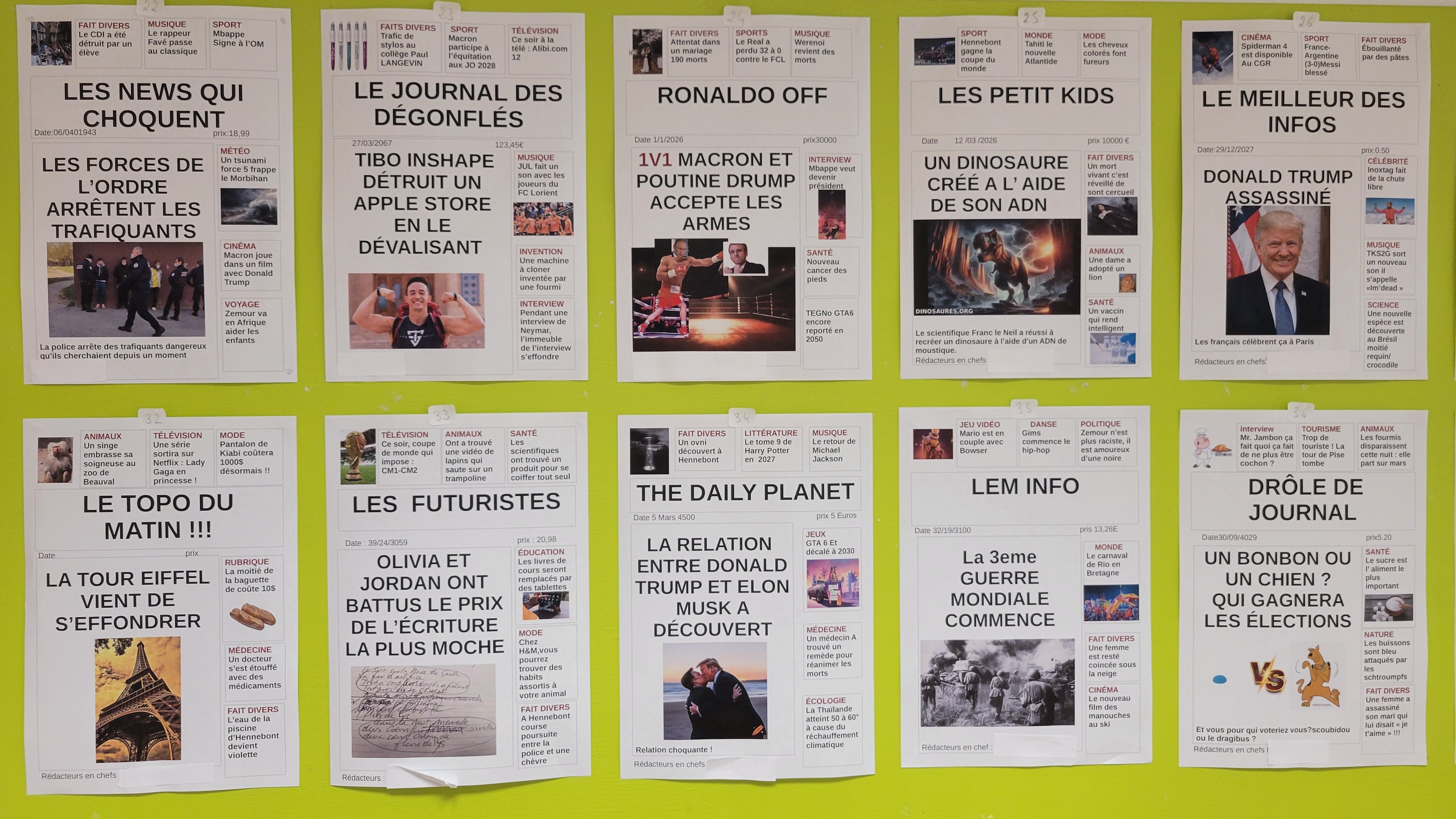 En toute connaissance de cause les élèves de 6ème du cours d'éducation aux médias et à l'information de Mme Lust ont inventé des fakes news en mettant l'accent sur l'humour et l'ironie : ils ont imaginé et créé, par deux, des unes de journaux complètement délirantes mais inspirées de l'actualité du moment.